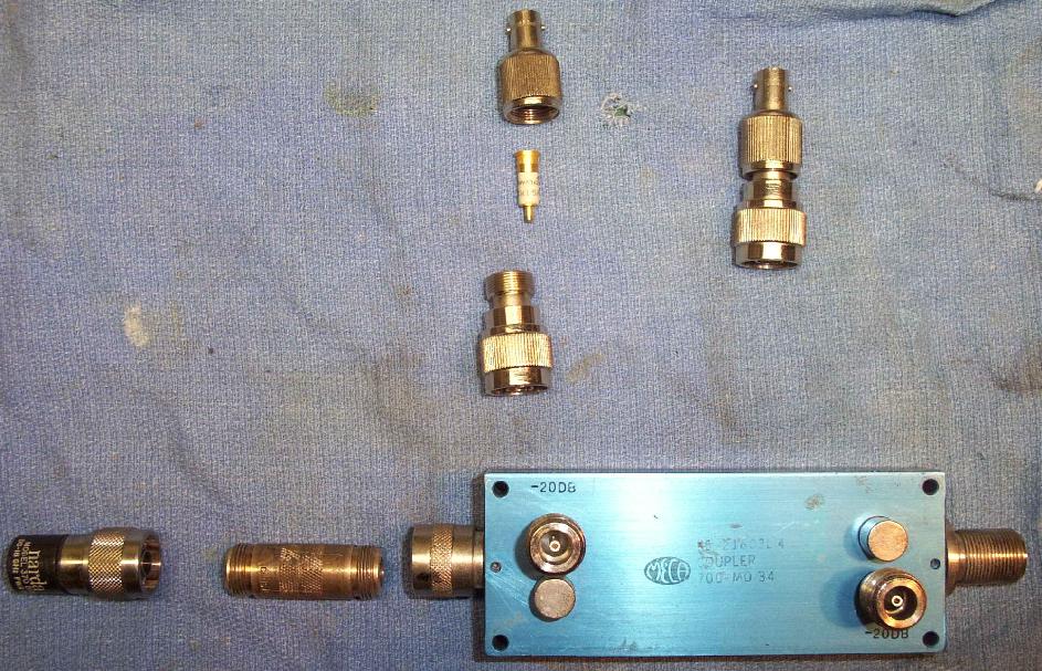 Overview of the hardware components used. The directional coupler is the large blue thing. A N-connector female-to-female adapter is needed to connect the Narda 5 Watt, 50 ohm load. The diode detectors are the silver things on top. They both are identical and house 1N23 point-contact diodes. Their voltage output is via integrated BNC connectors.
