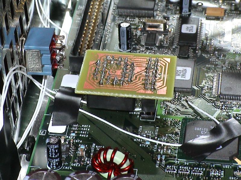 Now thanks to Max you can blow Cheapmods on your Matrix programmer. :-) Cadfael's PCB and switchCadfael (cad.fael@laposte.net) has sent the following nice pictures in from France, with a note:Andy, For the beginning I want to say that all the benefits must be sent to you for your wonderful tutorial on 'How build your homebrew LPC mod' and to Viperman from Xboxhacker for is modchip pcb. Many thanks to you. I was just concern on an easy way to plug and remove my modchip so I decided to use a pin header system to connect my modchip on the motherboard. This is just an extension to the tutorial mentioned before. It worked for me and I just want to bring my very very little stone to the scene. The only drawback is that you have to completely remove the motherboard to weld the pin header on the underside but it is a far better solution than wires (and also I think than the no solder pogo pins). It is stable, quick and easy to install, the mod can be removed with ease and replaced in seconds. No alignment, no setting up. The main benefit is that once your pin header is fitted you NEVER need to solder ANY mod into your XBOX ever again! Note also that the v1.1 consoles LPC holes are not filled in so it’s easier, just plug the header in and you're connected within minutes. For the patch wire, I chose to use the point 2 (GND) of the LPC connector cause like that I had only one 'difficult' point to weld on the motherboard instead of 2 (D0 and south side of C7C4) You can notice that I have also put a switch on the patch wire so I can easily turn on/off my modchip and boot on MS original bios or on my 'underground' one. Works fine too. I used the PCB of Viperman (works fine) with a pin header block and PLCC support for my chip. After programming my chip I only have to plug my chip on the motherboard. I sent you some photos, I suppose that it should be enough have a good idea of all the steps of my 'procedure'. Best regards from a french guy. |