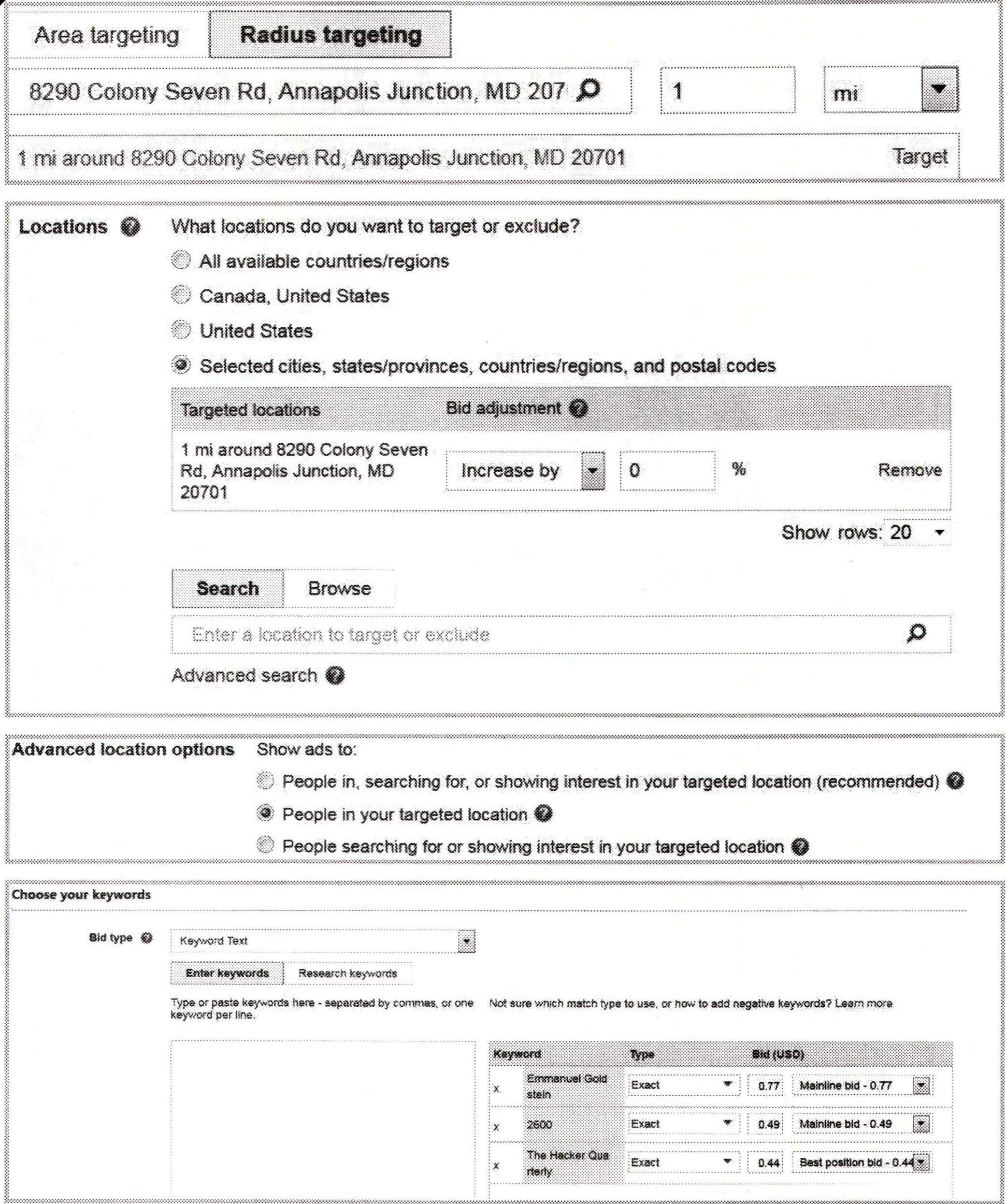 Anytime someone within a mile of this address searches for your keywords, it will show up in an impression. In this post-Snowden era of NSA surveillance, I suggest using a nearby address rather than the exact address to ensure this sort of activity cannot be easily flagged. Of course, this works best on keywords that will not generate false positives.