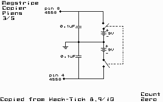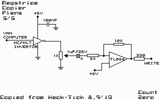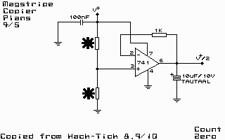 You can only write to a card which you have erase previously by, for instance, a demagnetizer. To doublecheck if your copy is good, you can listen to it by passing the read head over it and checking to see if the sound of the original and the copy are the same. We found ou that the human ear is a very accurate meter to indicate the accuracy of the copy. One last word about the dual opamp - pins 4 and 8 of that chip are used to supply positive and negative voltage (see schematic #3).