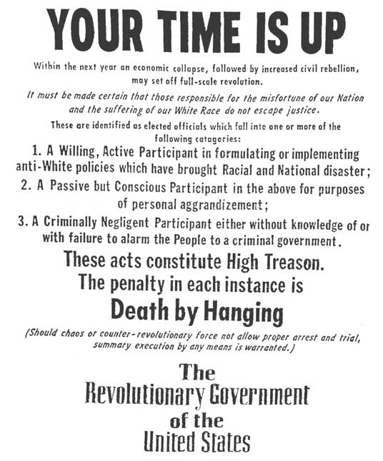 For our part, we will welcome and honor as COMRADES any White, bar none, who wishes to join with us in the struggle. ANY action taken against the Enemy, no holds barred, is a heroic deed. For our part, we will tolerate no divisive moralism to hamstring our efforts.