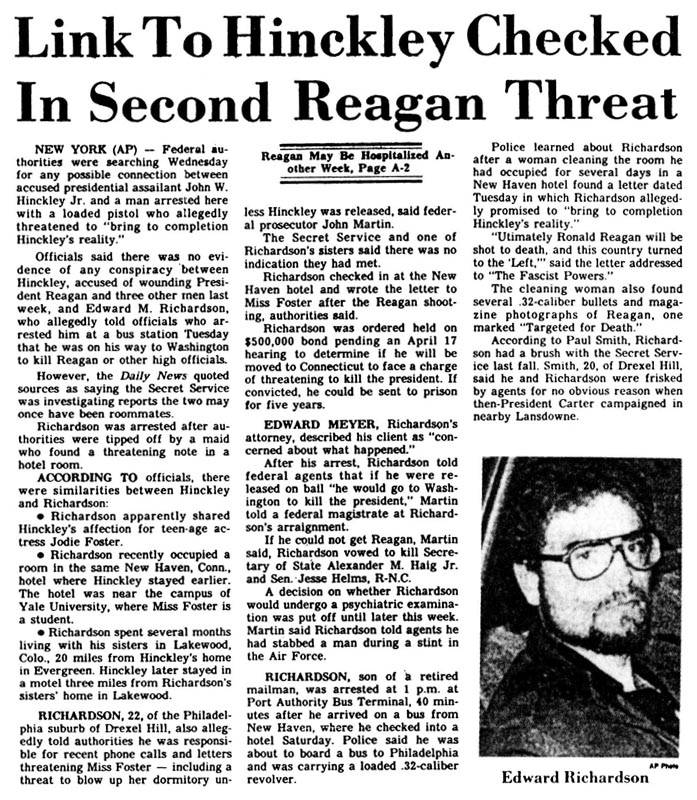 We know Hinckley had been with the Movement at one point. (They are now trying to deny even this but I have photos of Hinckley at a Nazi meeting.) In Big Brother lingo this translates out to mean Hinckley was a "Fascist" and a member of the "Right Wing". Then this character, "Edward Richardson", steps in and vows to complete what Hinckley started, identifies himself with the Left and uses such Big Brother catch phrases as "Fascist Powers". And he does it all in the arms of the Feds!