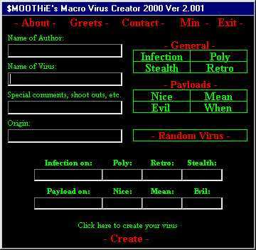 Hello! This is the first virus generator on the web. Do you want to have your own virus? Are you too lazy to learn assembler and write virus yourself? Are you afraid of downloading ms-dos virus generators? Never mind. I have created virus generator on the web for you. Just set virus parameters in your web browser and cgi-script on the server makes the virus for you. It's so easy. Then you can execute the virus on machine of somebody you don't like.