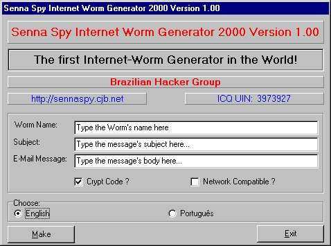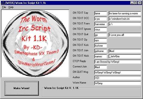 This is a "Simple" menu driven visual application for creating mIRC Worms. This program generates replicating mIRC Worm like programs from user-specified parameters. Basicly "EG. Fill in the Blank and press Make Worm" :-) Hopefully some one will get a copy of this and pick up a interest in programing HLL. New versions of mIRC do not support this type of worm at all only version 5.3x and before which use the same download dir as the mIRC program is located."