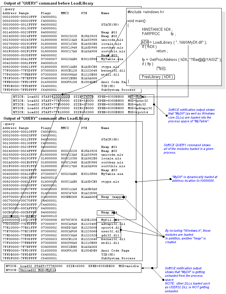 Program modules (EXE, DLL) and SoftICE "QUERY" command."QUERY" is one of the most useful SoftICE commands. It shows a map of various modules loaded in an user process space.The following figure shows you the output of "QUERY" command before and after Win32 API LoadLibrary call. As you can see, before Windows loads "MyDll.dll" in response to LoadLibrary, the process contains only initial set of modules including several heaps, read-only tables (e.g. unicode and locale) and minimal Windows system DLLs. Of course, the application for which the process is created, "MyTable.exe" is loaded at 0x400000. When Windows loads "MyDll.Dll", SoftICE echoes "load notification" in the form of "NTICE: ...". You see that "MyDll.dll" is loaded at address 0x10000000. Note that alog with "MyDll.dll", Windows is also loaded "USER32", "GDI32", "ADVAPI32" and "RPC" system DLLs. After LoadLibrary, the output of "QUERY" command shows the newly loaded modules, plus some heaps that are probably set up by one of the modules loaded. Finally, you see unloading of "MyDll" from the process when Win32 API FreeLibrary is called. At this moment, if you issue "QUERY" command again, you will no longer see "MyDll" in the output, BUT you will still see "USER32", "GDI32", and other DLLs still loaded! This is probably because Windows uses "lazy" policy for unloading modules - unload it only if explicitly told to do so.