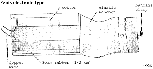 - A nice electrode for your penis can be made of a thin layer of foam rubber (about 1/2 cm) which is about 10 - 15 cm long and of the same width as the length of the penis. Two strips of any textile which is well absorbing water (cotton etc.) are glued on the foam rubber and being connected with copper wires as it can be seen on the picture. An elastic bandage, which is 20 - 30 cm long is glued on the backside of the foam rubber. A bandage clamp is used to fix the electrode when applied to the penis. Moisten the textile strips with salt water and wrap the thing around your penis so that one electrode covers the base of the shaft and one the glans.