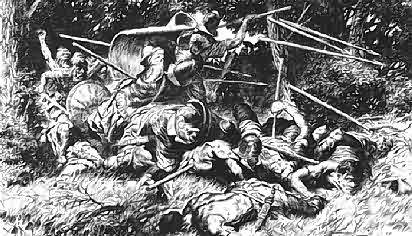 A skirmish during the Battle of Teutoburgerwald, where the Germans under Hermann Cherusci defeated a mighty Roman army. This 9 AD battle marked the turning point of the Roman Empire in the West. Hermann was a Romanized German who, once appointed to a senior post in the Roman army, used his position as a German prince to organize a rebellion against Roman rule in Germany. After creating a diversion and tricking the main occupying Roman army into penetrating a forest near the present day city of Detmold, Hermann's forces ambushed the Romans in the dense woods. The Romans were crushed, and retreated west over the Rhine river. That river then became the German/Roman border. 15,000 Roman troops were killed in the battle and their remains were only buried long after by a new Roman army sent on a punitive mission - their accounts tell of piles of bleached bones and skulls nailed to trees as macabre warnings to other Romans.