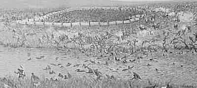 The few primitive spears thrown by the Zulus hardly even reached the wagons. The Zulus fell back, struck down by the White Wizards' magic killing sticks to which they had no answer. On the river side of the laager, the Zulus at first tried to attack through the water: bringing one of the cannons to bear, the Whites blasted the Black ranks at virtual point blank range, each shot killing dozens of Zulus.