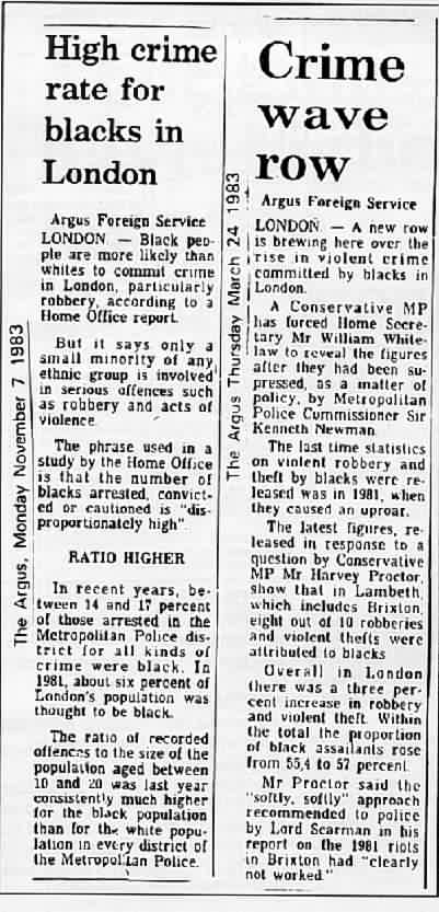 In 1983, a commotion erupted in Britain when the London Metropolitan Police issued figures showing that twice as many street crimes were committed by Blacks as by Whites in that city. The statistics showed that of 19,528 London victims of robbery and other street crimes, 10,960 identified their assailants as Black. Of the rest, 5,262 of the offenses were blamed on Whites and 534 on mixed race criminals. (Sunday Times, 27 March 1983).