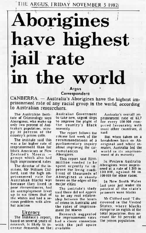 The Aborigines boast one of the highest crime rates of any racial group in the whole world, reflected in their imprisonment rate, which pro-rata is the highest anywhere. According to the Australian Institute of Criminology, the Aborigines, who make up only two percent of the country's population, account for 30 per cent of the inmates of the country's prison cells - a rate which is higher than American Blacks or New Zealand Maoris, two other groups identified by the Institute as having high imprisonment rates. (The Argus, 5 November 1982).