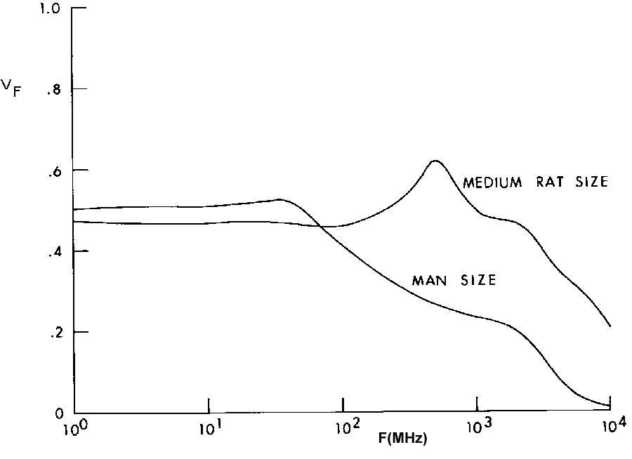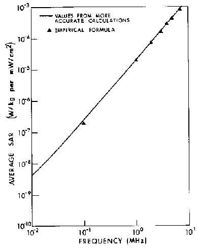 Comparing Equations 5.1 (up to resonance) and 5.19--and keeping in mind that input voltage aEo is applied across the input impedance and the radiation impedance of a monopole rather than a dipole antenna--the parameters R, L, and C of Equation 5.19 can be expressed in terms of Al, A2 and f o. Therefore, we first compute the parameters Al, A2, and fo so that the power calculated from Equation 5.1 will fit (with least-squares error) the numerical results of the SAR in a man model on a ground plane (Hagmann and Gandhi, 1979). The corresponding R, L, and C parameters will hence be valid for a half-spheroid in direct contact with a perfectly conducting ground plane. Introducing a small separation distance between the half-spheroid and the ground plane, in the form of an air gap or a resistive gap representing shoes, will correspond to adding the following Rg and Xg parameters in series with the previously derived resonance circuit: