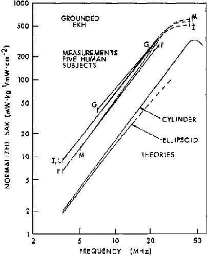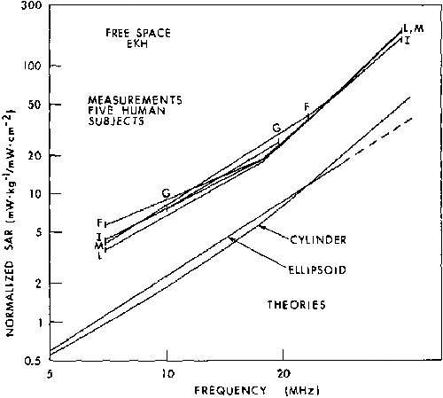 A possible explanation of the higher values lies in the very nonuniform distribution of SAR within the body, as explored extensively with thermographic techniques by Guy et al. (1976b, 1984) and illustrated by Figures 8.32 to 8.46. Measured local SAR values are as much as 13 times greater than average SAR values at 450 MHz. In particular the legs, which are relatively thinner and longer than the main trunk of the body, absorb significantly more than the average (see Figures 8.36, 8.46); the reason is explained qualitatively in Section 5.1.5. Since using pulse functions with the moment method to calculate local SAR in block models has been unsatisfactory (Massoudi et al., 1984), average-SAR calculation by the same method may not adequately include the higher local absorption in the legs, thus resulting in lower values of average SAR. Calculated average SARs in prolate spheroidal models, which are very close to those calculated in the block model, also would not account for higher absorption in the legs. Thus the calculated average SARs in both block and spheroidal models might be low because the calculations do not adequately include locally high SAR values. More calculated and measured values are needed to clarify the results.