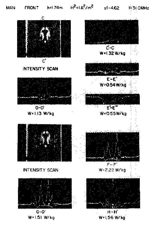 Scale-model thermograms and measured peak SAR for 70-kg, 1.74-m-height frontal-plane man model exposed to