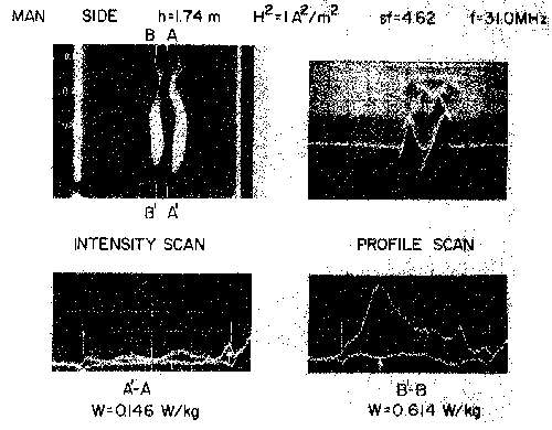Scale-model thermograms and measured peak SAR for 70-kg, 1.74-m-height medial-plane man model exposed to 31.0-MHz magnetic field perpendicular to the median plane: vertical divergence = 2ºC, horizontal divergence = 2.65 cm