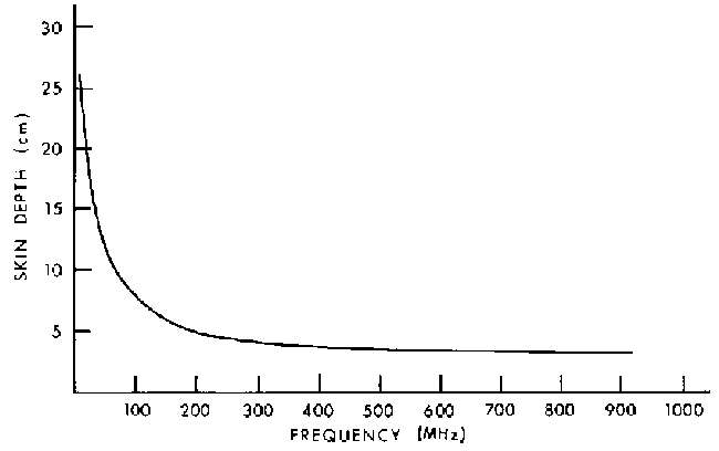 3.36. Skin depth versus frequency for a dielectric half-space with permittivity equal to two-thirds that of muscle