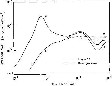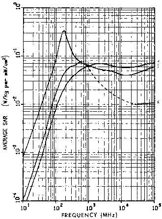 5.7. Calculated average SAR in a prolate spheroidal model of an average man, as a function of frequency for several values of permittivity