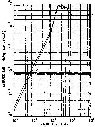 5.2. Average SAR calculated by the empirical formula compared with the curve obtained by other calculations for a 70-kg man in E polarization