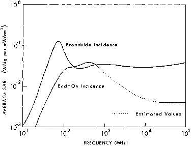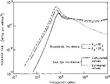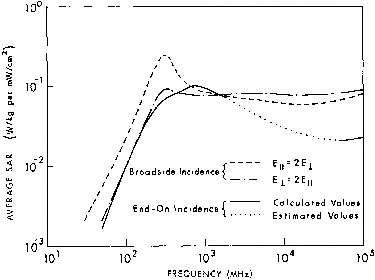 3.39. Calculated whole-body average SAR versus frequency for models of an average man for three standard polarizations