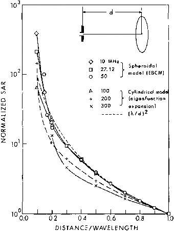 8.20. Measured relative SARs in scaled saline spheroidal models versus distance