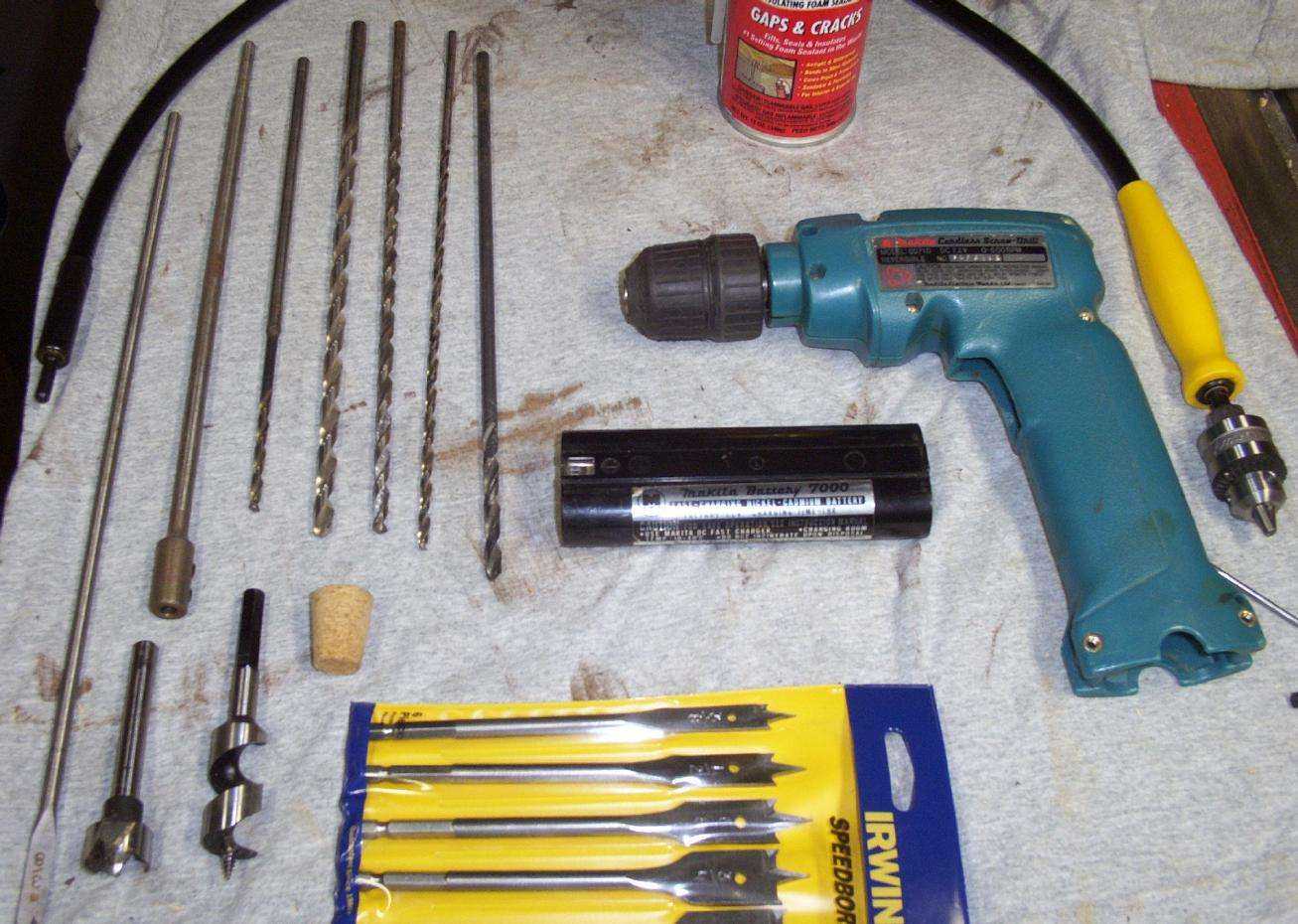 Overview on some of the pieces used in the GBPPR Silent Drill. Various drill bits are shown on the left. Get a good selection of sharp bits and extensions. Large wood boring bits are also very useful. Note the cork plug. This is useful for plugging the hole after drilling. The flexible drill shaft is along the top. It's a Disston 40-inch long, 1/4-inch shaft. The drill is an old cordless Makita. Look for cordless drills at thrift stores and rummage sales. The battery packs will be dead, but the drills will still work.
