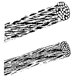 Air terminals are connected together and run to ground by means of standard conductors called "down conductors". For structures under 75 feet, standard copper conductors shall weigh not less than 187.5 lbs. per 1000 feet with individual wires not less than 17 gauge (NFPA 78 Code). A stranded copper conductor consisting of 29 strands of 17 gauge wire has a cross section of 59,500 circular mils (cm). If aluminum is used, the standard conductor shall weigh not less than 95 lbs. per 1000 feet with individual wires not less than 14 gauge. A stranded aluminum conductor consisting of 24 strands of 14 gauge wire has a cross section of 98,500 cm.