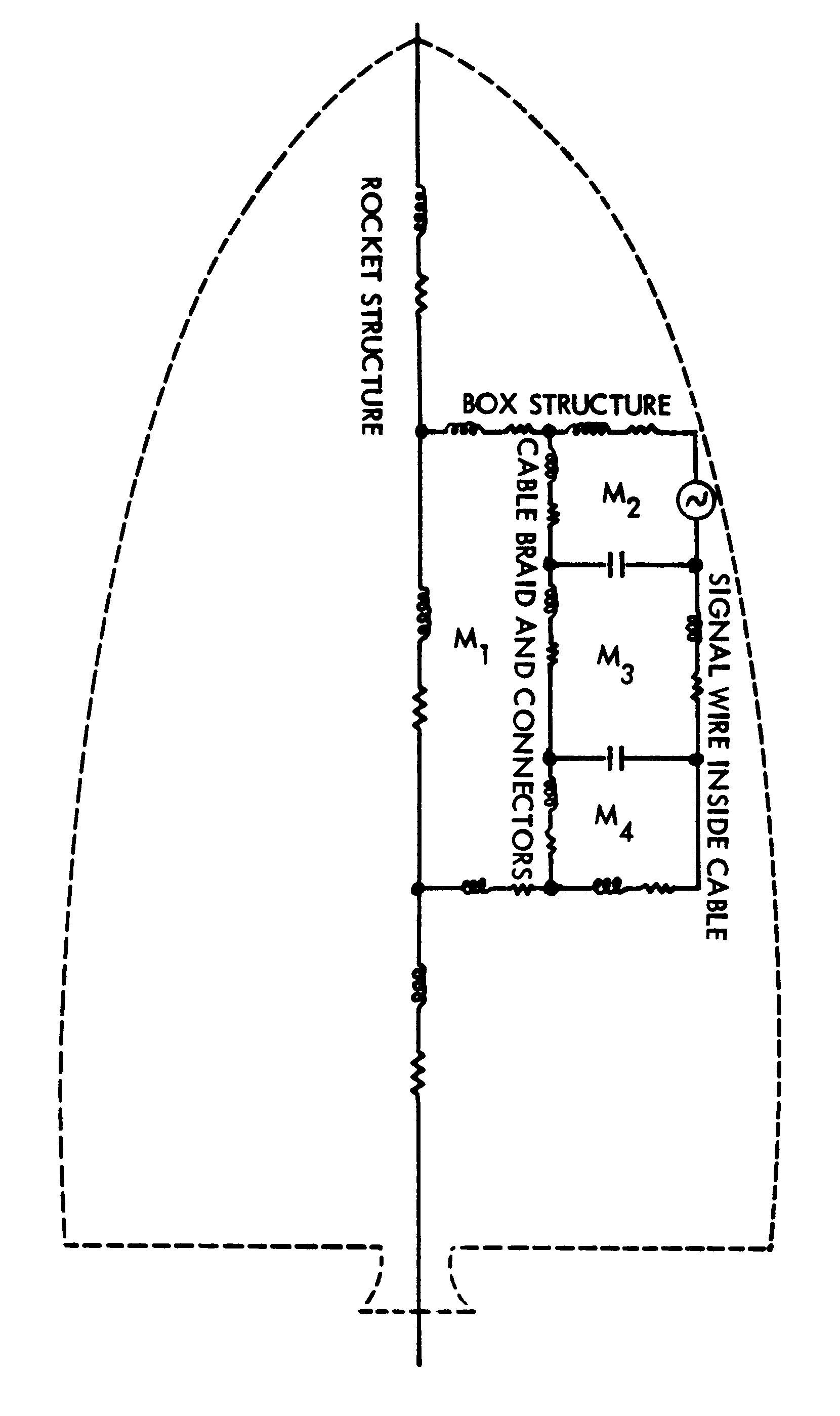 Figure 2 is an equivalent circuit model of the rocket showing the cable and internal circuit between electronics boxes. Structural capacitance is neglected for this case since it is assumed that its effects are much less than inductive effects. Resistance is easily estimated from the type of material used. An equivalent impedance network is shown in Figure 3.