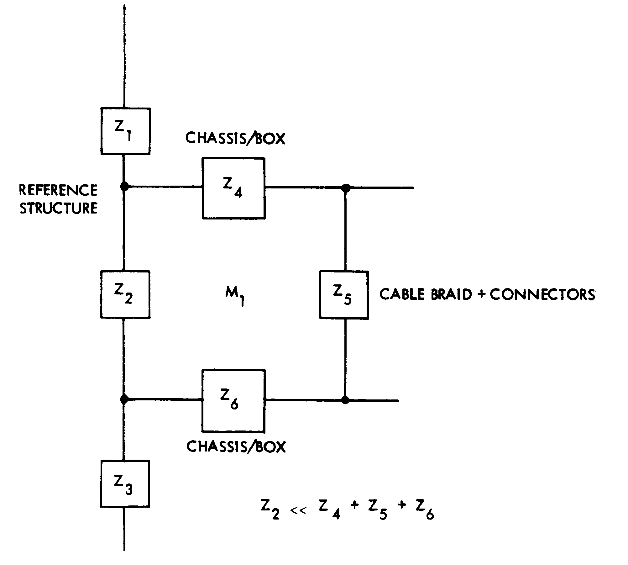 Since the loop of concern (mesh MI) is linear, and since the impedance of this loop is much less then the active circuit loops (M2 through M4), network analysis can be used directly to determine the current split in individual paths (cable braids or structure).