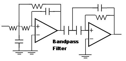 Fig. 3. Dual Two-pole Butterworth filters. Poles were set at 20Hz and 1.5kHz to make a bandpass. See attached schematic for values. Opamps were specifically chosen for low-noise, low-current properties.After filtering, the signal was fed directly into another audio amplifier in order to drive an output speaker. This part of the circuit was identical to Figure-2.