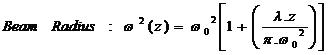 Fig. 5. Beam Radius w(z) over some distance z; given starting beam radius w0 and wavelength lambda.Improvements in optical capturing can be easily enhanced with lenses. The ability to capture light from a broadened beam radius is paramount in beam recovery. Telescopic lenses combined with an optical filter would provide a better means of recovering the signal and removing the noise before electrical components are used.