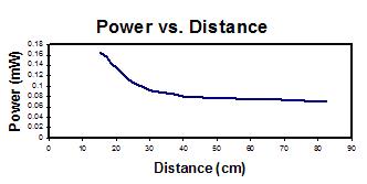 Fig. 3. Power versus distance. As expected, at longer distances, the power of the recovered signal decreased. 80 cm represents the maximum distance on the optical table on which this project was performed.
