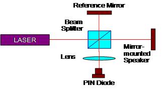 The optical stage directs laser light through a beam splitter. The forward path strikes a mirror which is mounted on a speaker head. The laser is directly modulated by the speaker by an audio signal. As the beam returns, it passes back through the beam splitter and is focused using an objective lens onto a photodiode. The second path which splits from the beam splitter is reflected back by a reference mirror and then recombined at the beam splitter with the first returning beam. In a true interferometric system, the second branch of the beam splitter is used as reference to detect the phase difference caused by the changing path length of the first branch. In this way, very small vibrations can be detected by examining the signal at the photodiode. Figure-1 illustrates the basic schematics of the optical design implemented.