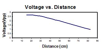 Fig. 4. Voltage versus Distance. The trend follows power as expected.Signal to noise ratio (SNR) is a measure of the power of the signal over the power of background noise. At the photodiode before filtering, the laser microphone system exhibited a signal-to-noise ratio of 3.7 dB. There are many ways to improve this number by addressing enhancements in both the optical and electrical configuration.