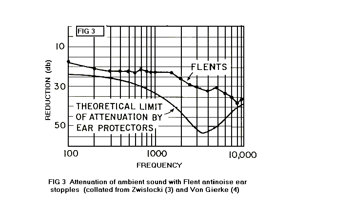 As shown in Table 1, we have used a fairly wide range of transmitter parameters. We are currently experimenting with transmitters that radiate energy at frequencies below 425 MHz, and are using different types of modulation, e.g., pulse-repetition rates as low as 3 and 4/sec. In the experimentation reported in this section, the ordinary noise level was 70-90 dB (measured with a General Radio Co. Model 1551-B sound-level meter). In order to minimize the RF energy used in the experimentation, subjects wore Flent anti-noise ear stoppers whenever measurements were made. The ordinary noise attenuation of the Flents is indicated in Figure 3. Although the RF sounds can be heard without the use of Flents, even above an ambient noise level of 90 dB, it appears that the ambient noise to some extent "masked" the RF sound.