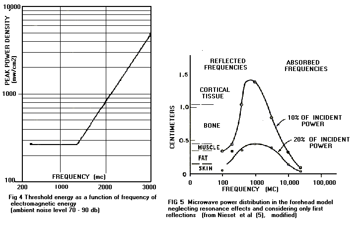 Table 2 gives the threshold for perception of the RF sounds. It shows fairly clearly that the critical factor in perception of RF sound is the peak power density, rather than the average power density. The relatively high value for transmitter "B" was expected and will be discussed below. Transmitter "G" has been omitted from this table since the 20 mW/cm² reading for it can be considered only approximate. The field-strength-measuring instruments used in that experiment did not read high enough to give an accurate reading. The energy from transmitter "H" was not perceived, even when the peak power density was as high as 25 W/cm². When the threshold energy is plotted as a function of the RF energy (Figure 4), a curve is obtained which is suggestive of the curve of penetration of RF energy into the head. Figure 5 shows the calculated penetration, by frequency of RF energy, into the head. Our data indicate that the calculated penetration curve may well be accurate at the higher frequencies but the penetration at the lower frequencies may be grater than that calculated on this model.