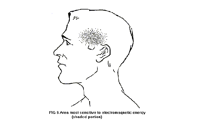 Another possible location for the detecting mechanism is in the cochlea. We have explored this possibility with nerve-deaf people, but the results are inconclusive due to factors such as tinnitus. We are currently exploring this possibility with animal preparations. The third likely place for the detection mechanism is the brain. Burr and Mauro (6) presented evidence that indicates that there is an electrostatic field about neurons. Morrow and Sepiel (7) presented evidence that indicates the existence of a magnetic field about neurons. Becker (personal communication) has done some work indicating that there is longitudinal flow of charge carriers in neurons. Thus, it is reasonable to suspect that possibly the electromagnetic field could interact with neuron fields. As yet, evidence of this possibility is inconclusive. The strongest point against is that we have not found visual effects although we have searched for them. On the other hand, we have obtained other non-auditory effects and found that the sensitive area for detecting RF sounds is a region over the temporal lobe of the brain. One can shield, with a 2-inch square piece of fly screen, a portion of the strippled area shown in Figure 6 and completely cut off the RF sound.