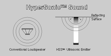 HSS fundamentally works by emitting a beam of high frequency ultrasonic energy which is converted to an audible acoustic wave in mid-air. An important by-product of the technique is that sound may be directed to just about any desired point in the listening environment. This provides outstanding flexibility, while allowing an unprecedented manipulation of the soundís source point.