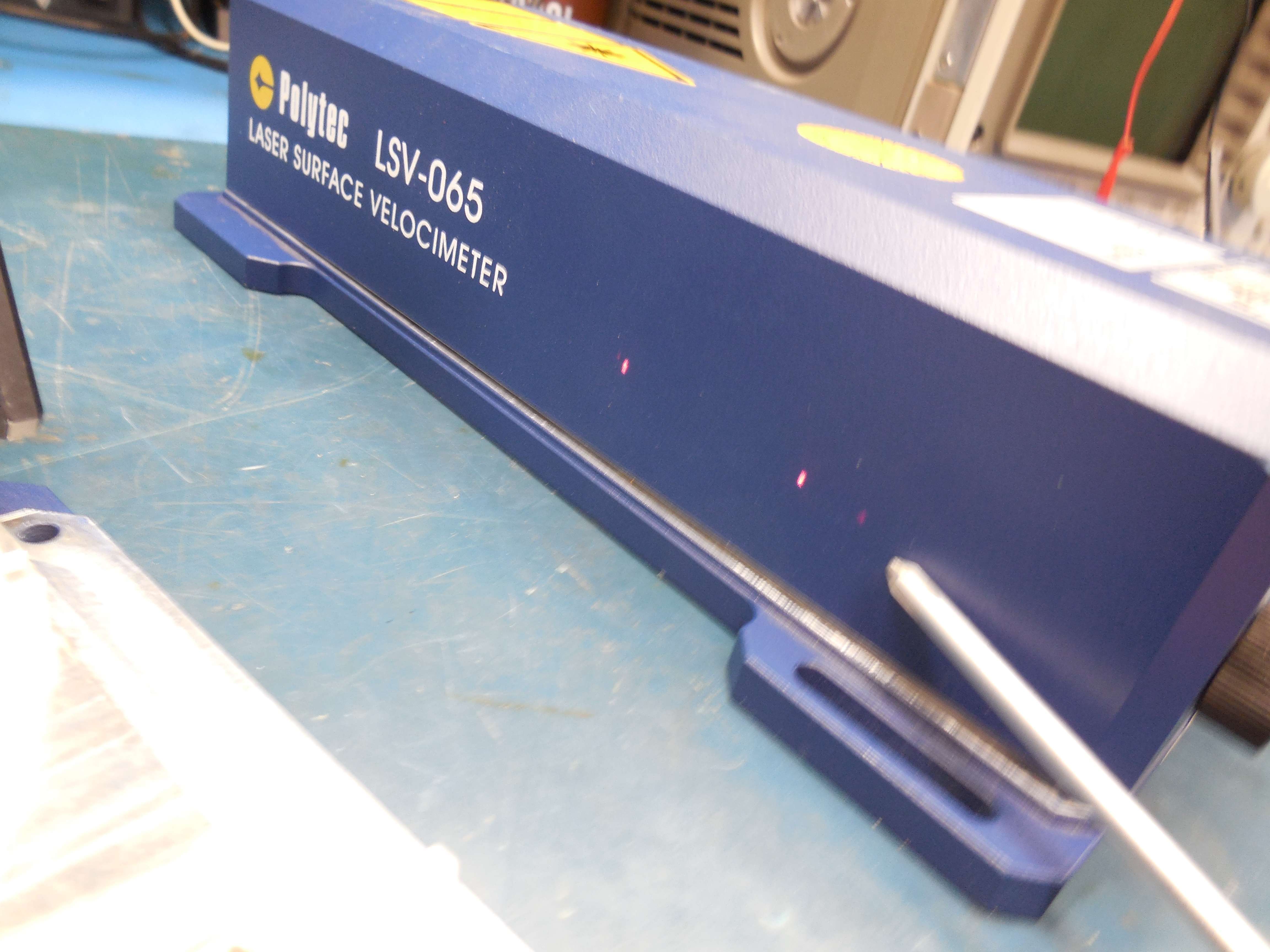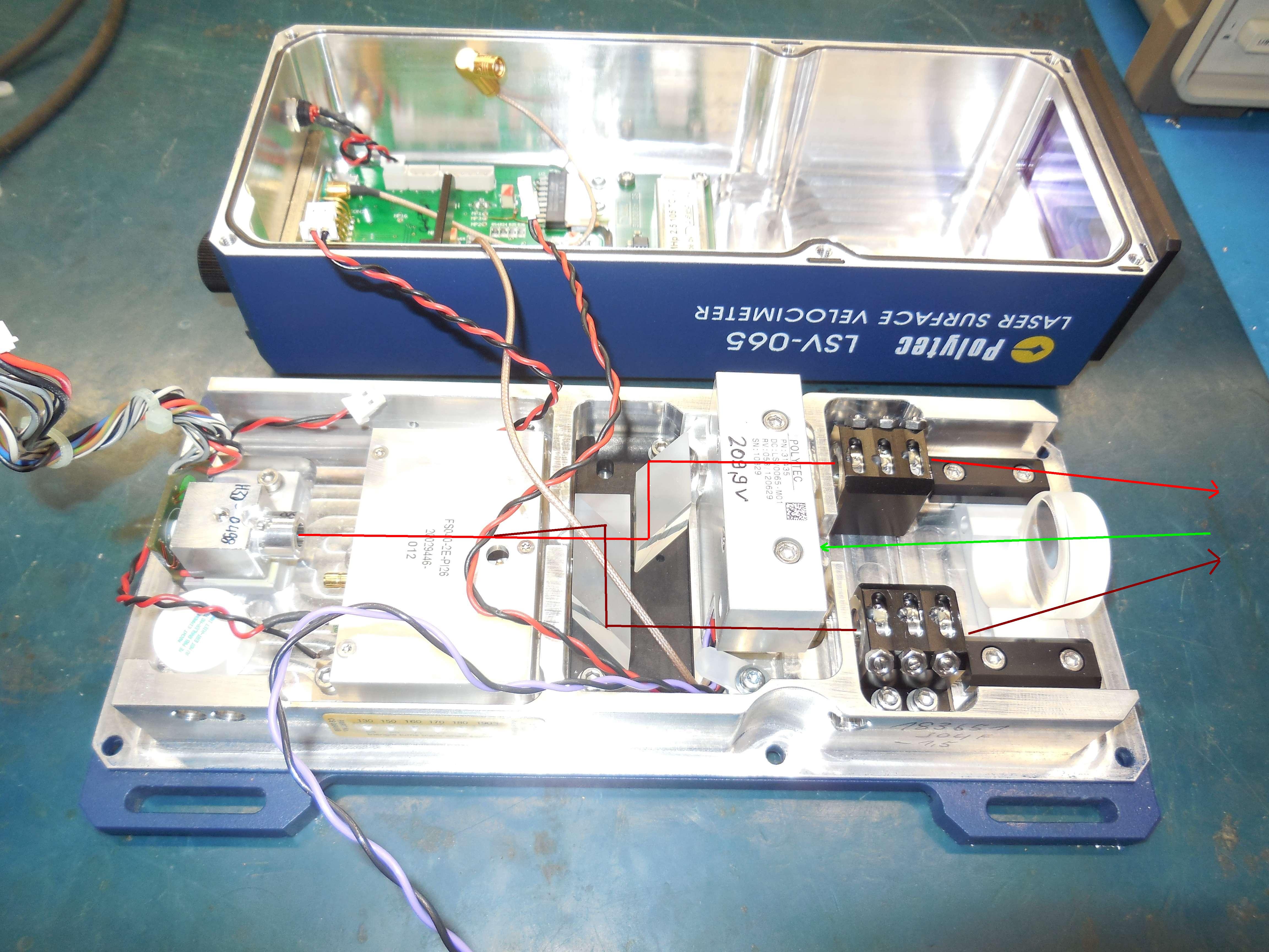 Internal view of a stock Polytec LSV-065 Laser Surface Velocimeter showing the laser beam paths.
