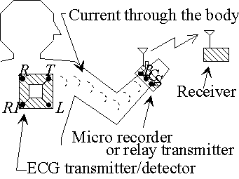 ECG SYSTEM The schematic of an ECG monitoring system is shown in Fig.2. The ECG detector/transmitter, located on the chest, has three detection electrodes (R,L,RF), and an electrode for signal transmission (T). The detected ECG is amplified and modulated, then applied between electrodes T and RF. The signal is turned into AC micro current and can be transmitted through the body. It is then detected by the relay transmitter placed on the wrist that has three detection electrodes. The power necessary for this transmission is only 8µW (400mVRMS x 20µARMS), and can be driven by a very small battery. This concept is useful for multi-monitoring of health parameters because each detector part should not have its own RF transmitter so as to minimize the electromagnetic noise problems and to achieve low power consumption.