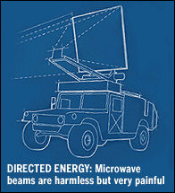 Imagine a cross between a microwave oven and a Star Trek phaser: a tight, focused beam of energy that flash-heats its target from a distance. Directed energy beams do not burn flesh, but they do create an unbearably painful burning sensation. The Air Force Research Laboratory has already spent $40 million on a humvee-mounted directed-energy weapon. Expect to see it in the field by 2009.