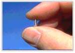 THE ACTUAL SIZEComputer Microchip: The microchip stores a unique identification number from 10 to 15 digits long. The storage capacity of the current microchips is limited, capable of storing only a single ID number. AVID (American Veterinary Identification Devices), claims their chips, using a nnn-nnn-nnn format, has the capability of over 70 trillion unique numbers. The unique ID number is "etched" or encoded via a laser onto the surface of the microchip before assembly. Once the number is encoded it is impossible to alter. The microchip also contains the electronic circuitry necessary to transmit the ID number to the "reader".