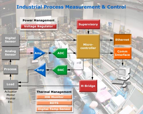 Industrial applications are used across many industries, including agriculture, automotive, medical, military, and testing labs to name a few. They are used for assembly, manufacturing, instrumentation, packaging, and communications. Throughout these processes, data is continually being monitored through sensors, digitized, analyzed, collected and stored. National offers amplifiers, A/D converters, temp sensors, and power management devices to complete the signal chain.