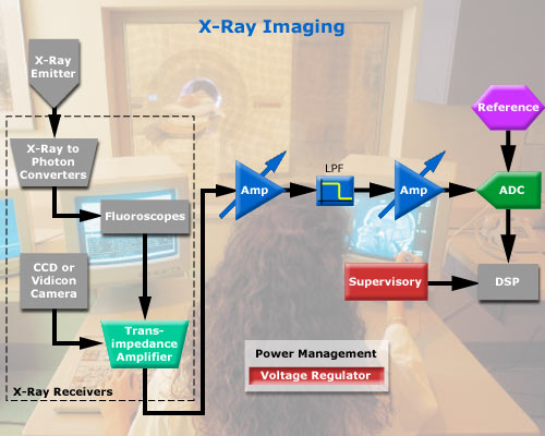 X-Ray Imaging is an old technology that today still progresses forward through the advancements in analog technology. Once the x-ray receivers receive the signals, the analog in the system amplifies, filters, and converts the signal to a digital format for the DSP. The accuracy and clarity of the x-ray system is directly related to the quality of the signal. Therefore, providing accurate analog solutions, such as references and regulators, is vital for a successful x-ray system. Component Highlights |