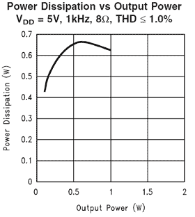 Conditions: VDD = 5V BTL connection RL = 8 Ohms Heat sink = 120mm2 Package = 10pin LD PDMAX: Calculated = 633mW From Graph = 670mW (See Graph 2)