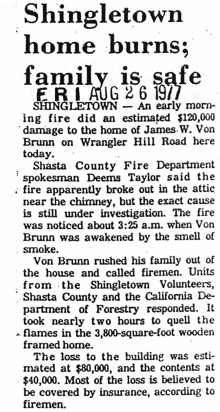 JVB was inspecting the ashes the morning after the fire when a man approached and introduced himself as a neighbor. A retired logger, he lived about three quarters of a mile away, down in the valley. He said he believed the fire was arson. About 1:30 AM he was awakened by his boar hounds. He went outside to quiet them. “I heard a pop — like a flare gun — from up your way.” Then he heard car doors slam, followed by the squealing of tires on the blacktop.