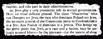 This fight between Communists and Zionists has lasted right down to the present day. When the state of Israel was formed, tens of thousands of Zionists were permitted to emigrate from Russia and satellite territory to Palestine, in a move which still continues at this writing. (We should note that non-Jews are NEVER permitted to emigrate from Communist Russia). But communist authorities have been exceedingly reluctant to permit young Jews to emigrate, and in many cases permission has been denied. Thus the fight continues. But the reader should remember that this is a fight between Jews. Whether Communists or Zionists, they still retain their Jewishness, and they stand united against all non-Jews. And although they travel different paths, both Communism and Zionism have the same common goaldomination of the world. Both work and plan for the day when the "chosen race" shall "inherit the earth."
