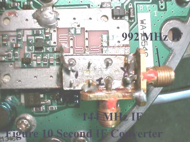 The second conversion stage consists of a second LO amplifier (1136 MHz) and SRA-11 mixer converting the 992 MHz 1st IF to the 144 2nd IF. A 992 MHz filter is required between two conversion stages. Both Evanescent mode and coaxial ceramic filters have been used.
