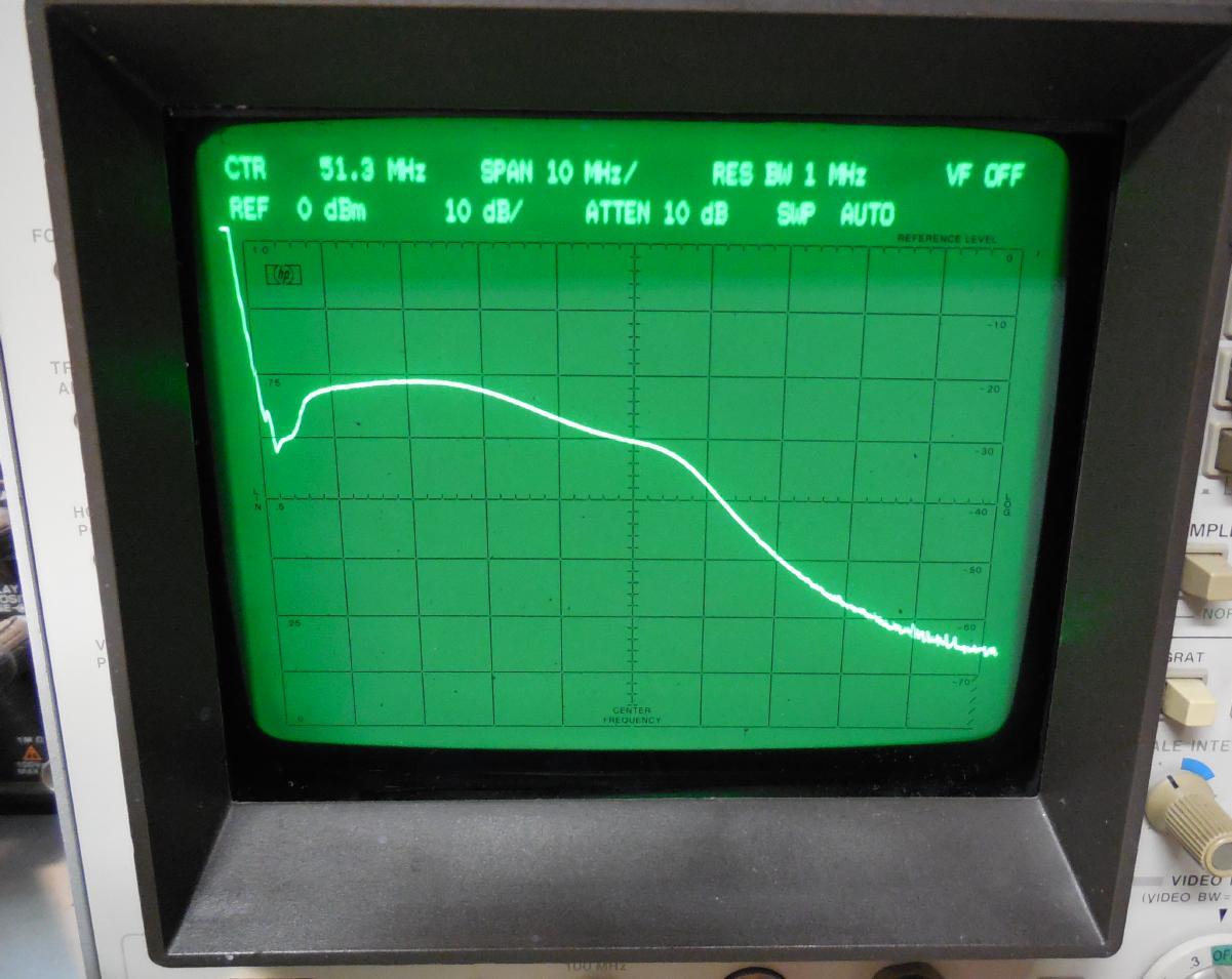 Center frequency is 51.3 MHz. 10 MHz per horizontal division, 10 dB per vertical division.