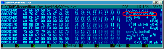 Хорошо, а если бы разработчик защищенного приложения, не поленился бы воткнуть проверку на успешность загрузки функции EvalModeTestVB и при ее отсутствии немотивированно прекращал свою работу? Смогли бы мы тогда узнать: какие функции библиотеки lockout используется, а какие нет? Уговорили! Взломаем программу другим путем! Погоняем курсор к MyCDPro.exe и, нажав на Прямым текстом: "lockout.dll" и рядышком с ней EvalModeTestVB. Имена остальных защитных функций в исследуемой программе отсутствуют. Самое забавное, что в модуле lockout.dll присутствует огромное количество строк типа: "'User has turned back their clock, so calculating days based on last and init", "The CRC file is valid", "Failed to update the Last Accessed time", - т. е. защита составлена довольно грамотно и в состоянии как следует за себя постоять. Если, конечно, разработчик защищаемого приложения использовал все, предоставленные ей возможности, сполна. Увы, этого не произошло и на этот раз…