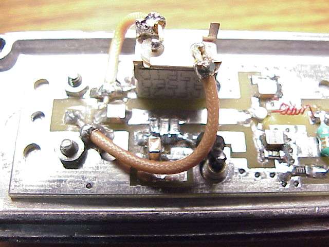 The beast. The PF0031 based power amplifier. I say it's only 6 watts, but in reality, it'll do 10 watts easy. Note, however, in the following pictures you'll need to perform some serious RF engineering skillz, otherwise the amplifier will oscillate, probably destructively (AKA, blow up). I salvaged the heatsink and copper heat spreader from and old Nokia cellular phone. I suggest you try to do the same. The PC board the amplifier is mounted to was bought surplus from Down East Microwave, #CL11. This isn't the right PC board, so it will need some modifications to fit the module. The PF0031 module is available from RF Parts.
