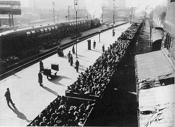 passenger train leaving for the town of Lübeck in 1946, one full year